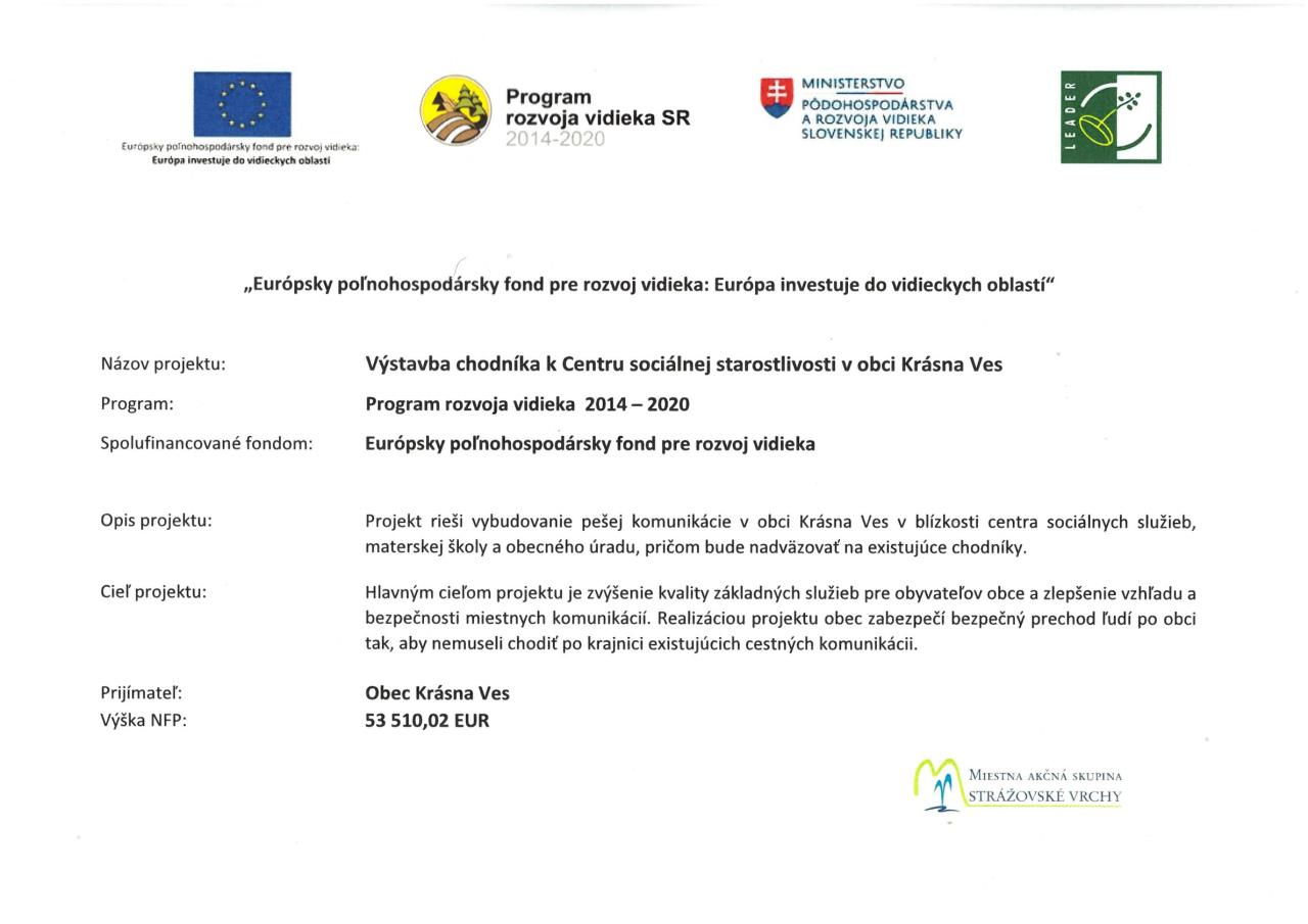 Nenávratný finančný príspevok projektu č. 309070FVN1 s názvom "Výstavba chodníka k Centru sociálnej starostlivosti v obci Krásna Ves", z Programu rozvoja vidieka 2014 - 2020, spolufinancovaný z Európskeho poľnohospodárskeho fondu pre rozvoj vidieka v sume NFP: 53 510,02 EUR.